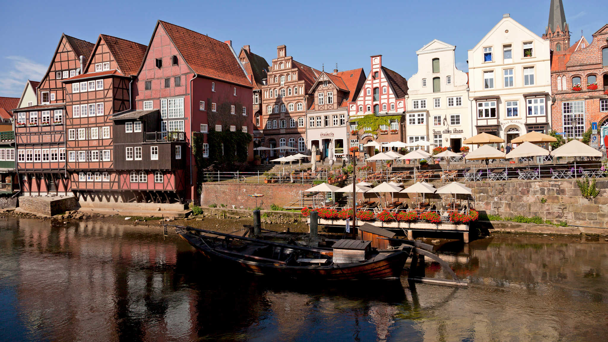 Lüneburg war einst eine der reichsten Städte Norddeutschlands – dank Salz. Über Jahrhunderte wurde das „weiße Gold“ hier abgebaut und vom alten Hafen aus verschifft. Der einstige Wohlstand prägt bis heute das Stadtbild: Rund um den Platz „Am Sande“ reihen sich beeindruckende Giebelhäuser mit Backsteinarchitektur aneinander – ein typisches Merkmal der Blüte der norddeutschen Hansezeit. Viele Gebäude stehen heute leicht schief, denn der unterirdische Salzabbau ließ den Boden absacken. Entlang der Ilmenau kannst Du wunderbar spazieren – und wenn Du mehr Natur willst, bist Du in der nahen Lüneburger Heide schnell im Grünen.